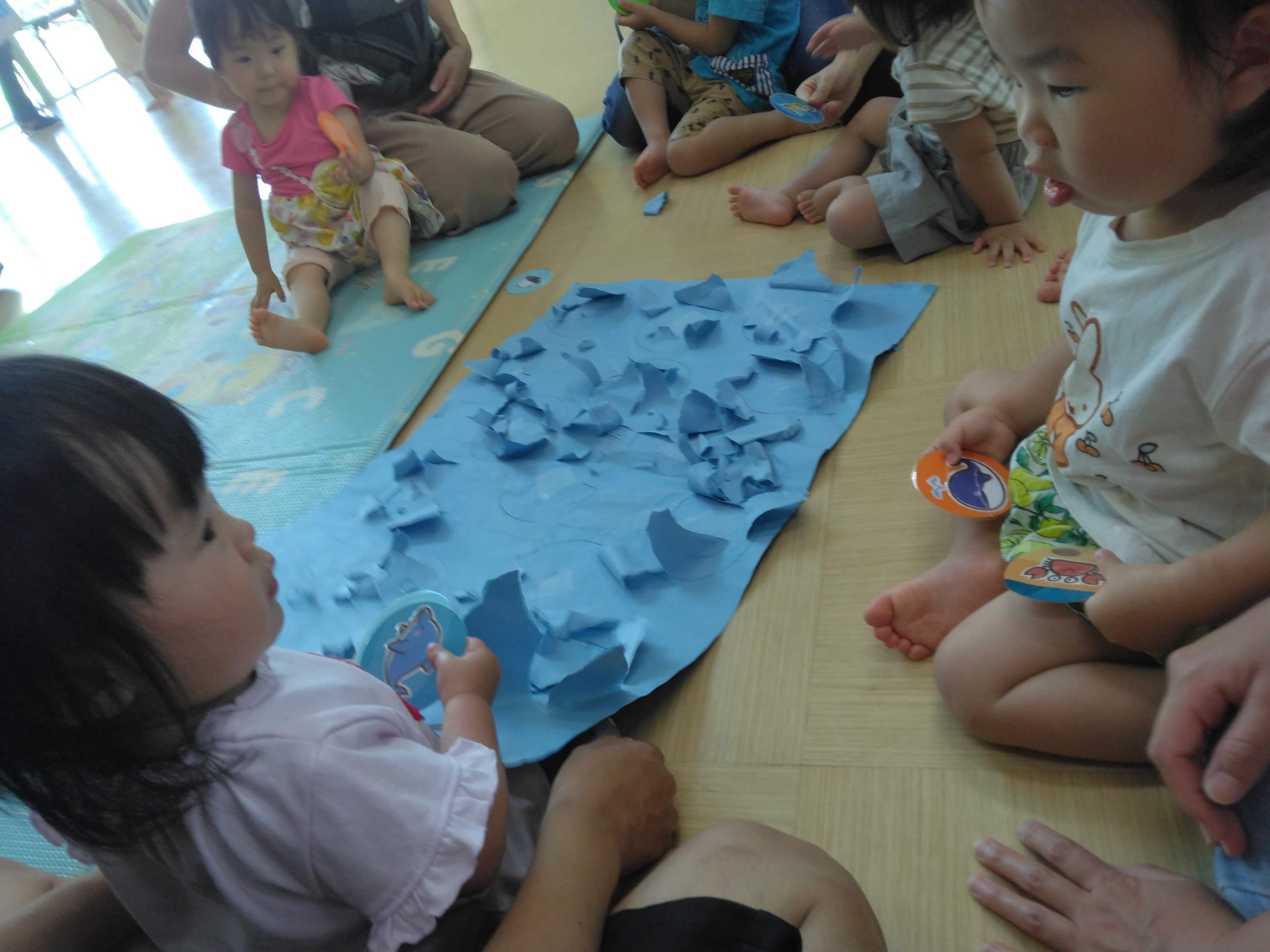あっという間に剝がしてしまいました。この遊びは、小さなお友達も集中してできましたね。出てきたお魚たちは、みんなのおうちに一緒に連れて帰ります。