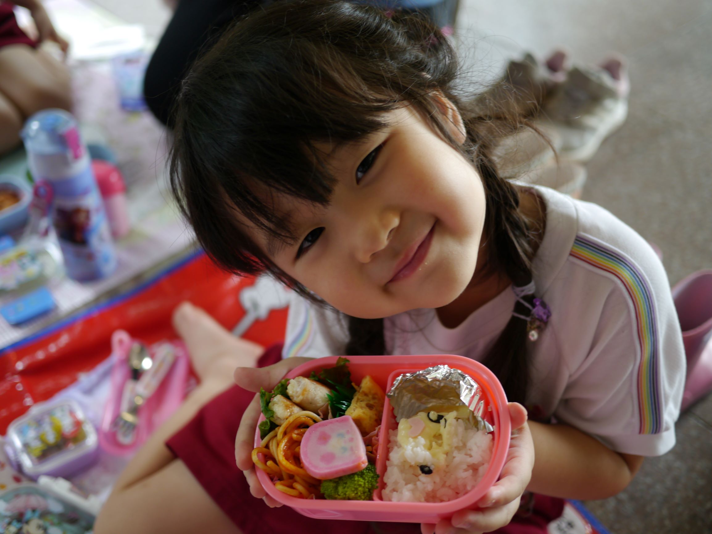 ガラス張りの床の下に、魚たちを見つけて、思わず寝転んで見入る子どもも。見てください、この真剣な眼差し。 そして最後は、お決まりの愛情たっぷりお弁当!どんな時にも、手作りのお弁当は、子どもたちの心にも体にも栄養をたっぷり届けてくれますね。